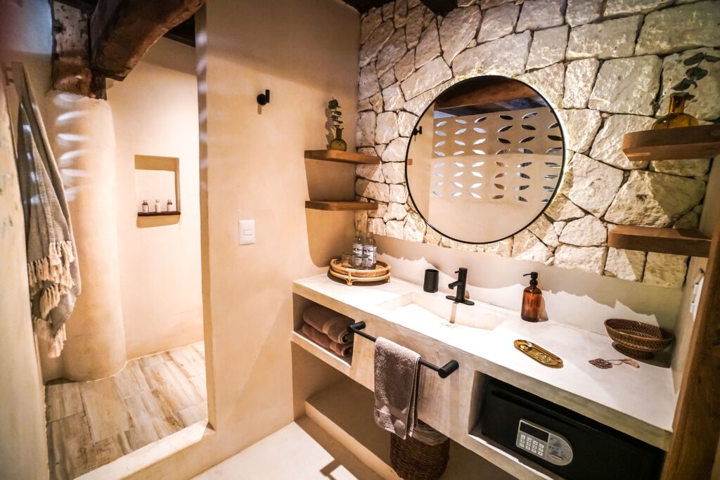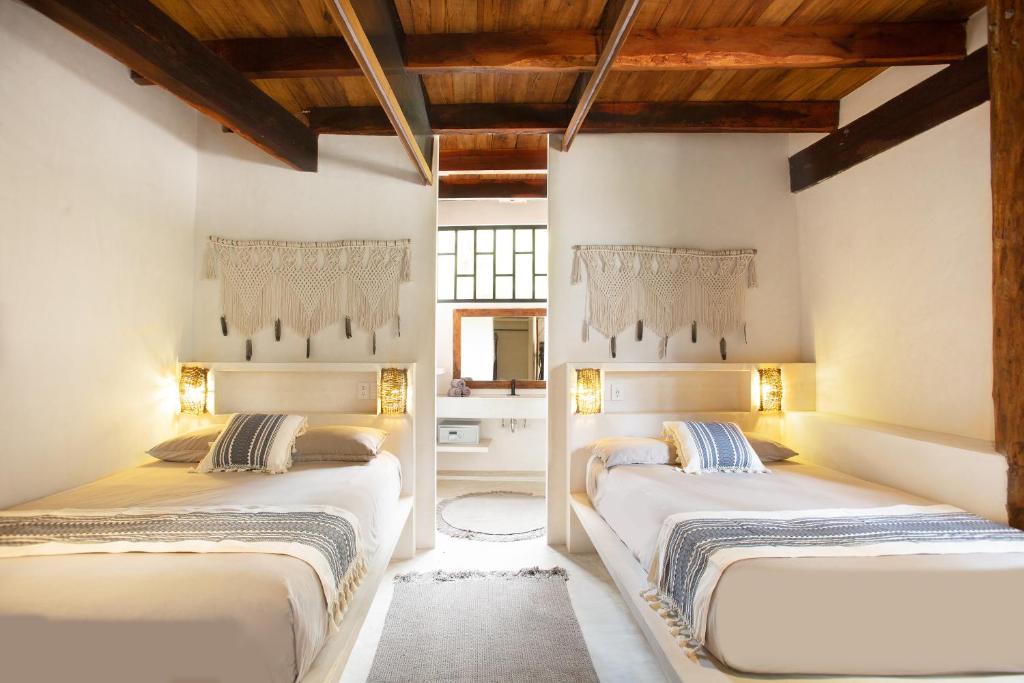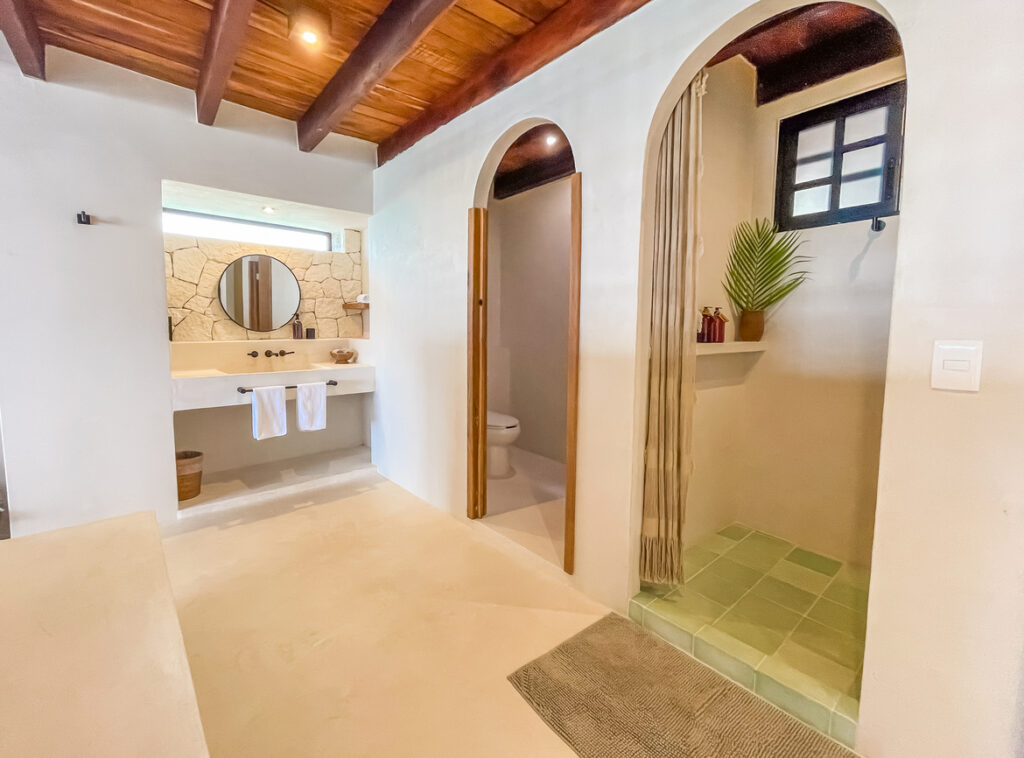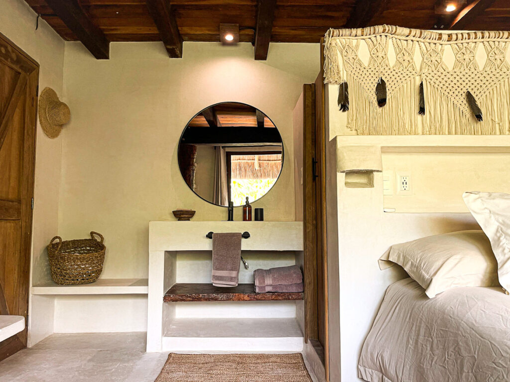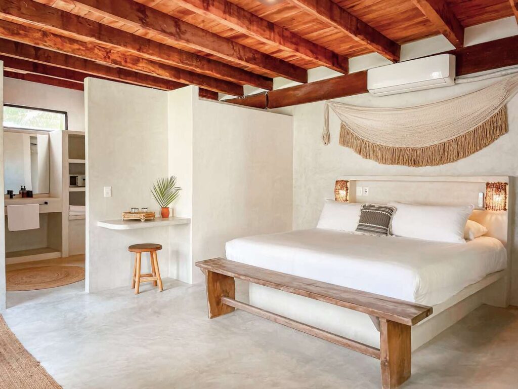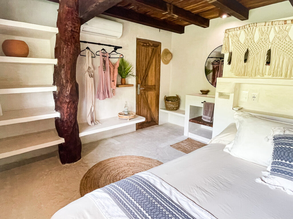A spacious room with three beds, 3 closets, private bathroom, and a safe. It's not directly on the beach but steps to the sea. This option is best for solo female travelers looking to share, or friends / family.